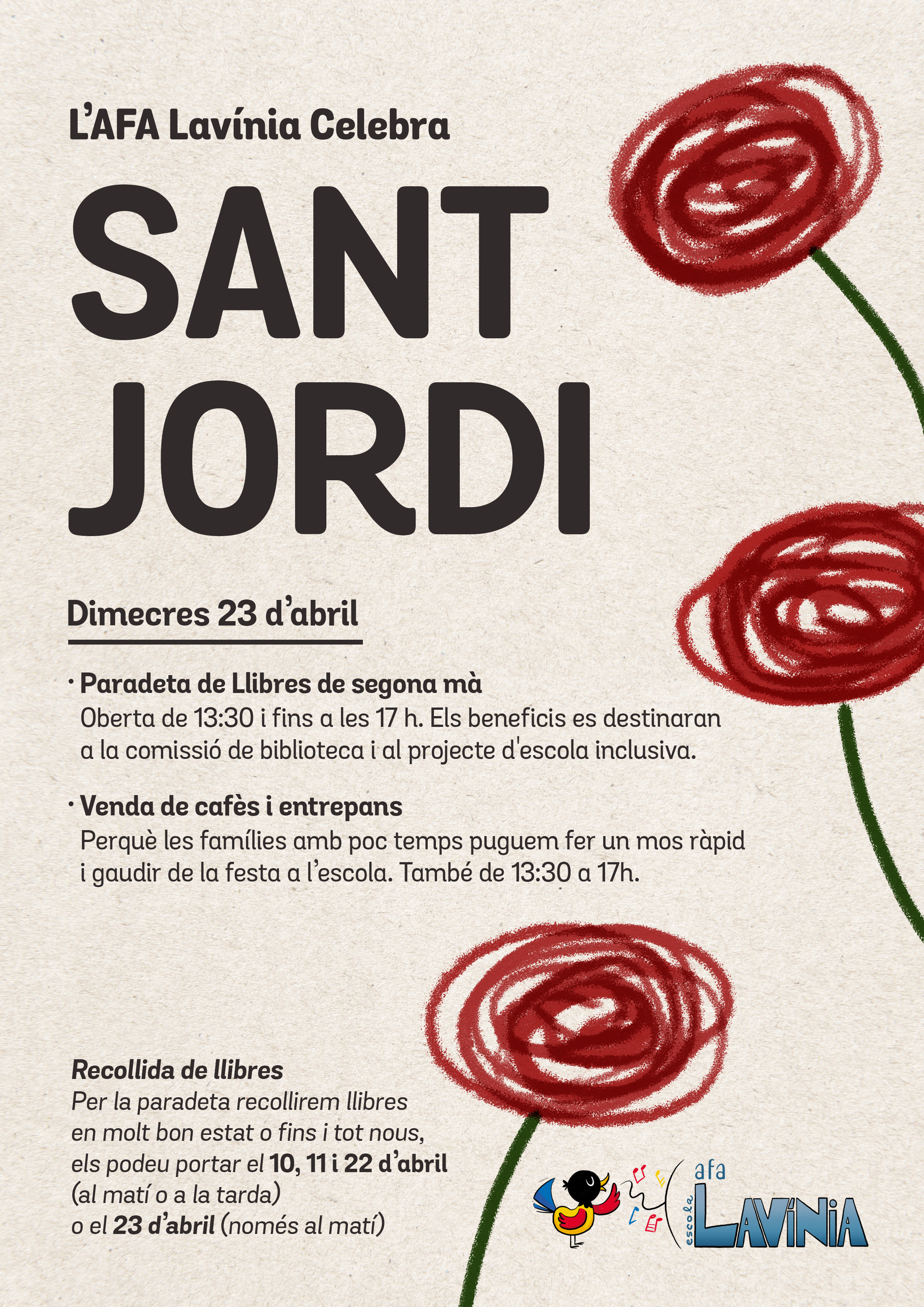 Des de l’AFA ja hem començat a planejar el proper 23 d’abril, diada de Sant Jordi. Hem decidit tornar a muntar una paradeta, que enguany serà de llibres de segona mà, que estarà oberta des de les 13:30 i fins a les 17 h. Els beneficis es destinaran a la comissió de biblioteca i al projecte d’escola inclusiva.