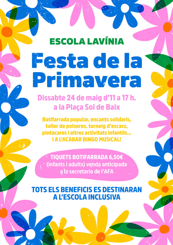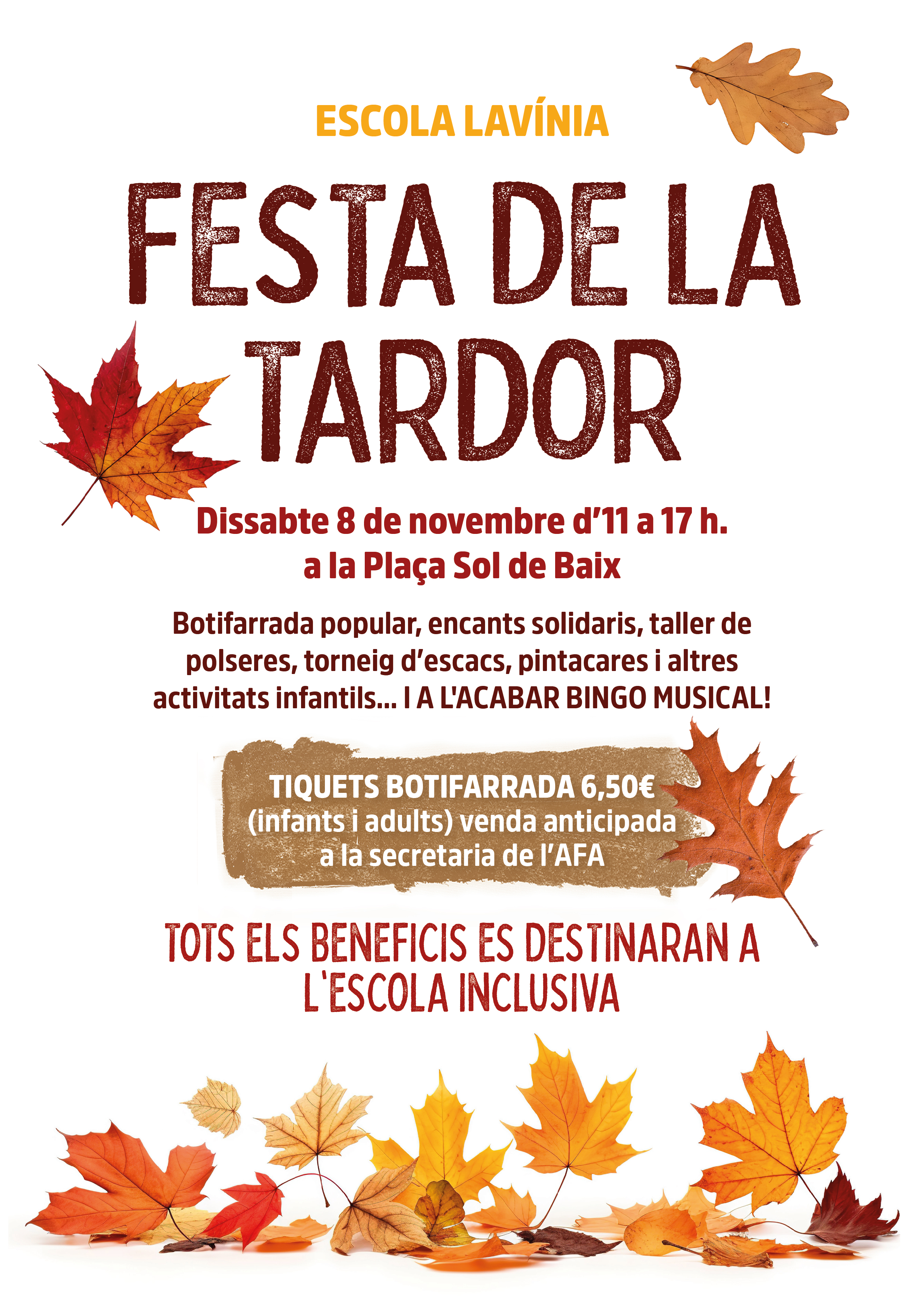 El proper dissabte 08 de novembre des de les 11h fins a les 17h, celebrem la Festa de la Tardor a la Plaça Sol de Baix. Amb botifarrada popular, encants solidaris, tallers, torneig d’escacs…i a l’acabar, Bingo Musical!. Els tiquets per la botifarrada es poden adquirir d’avançada a la secretaria de l’AFA. Tots els beneficis recaptats es destinaran a l’Escola Inclusiva, amb la finalitat que tots els alumnes de la nostra escola puguin gaudir de les sortides i els serveis durant el curs.