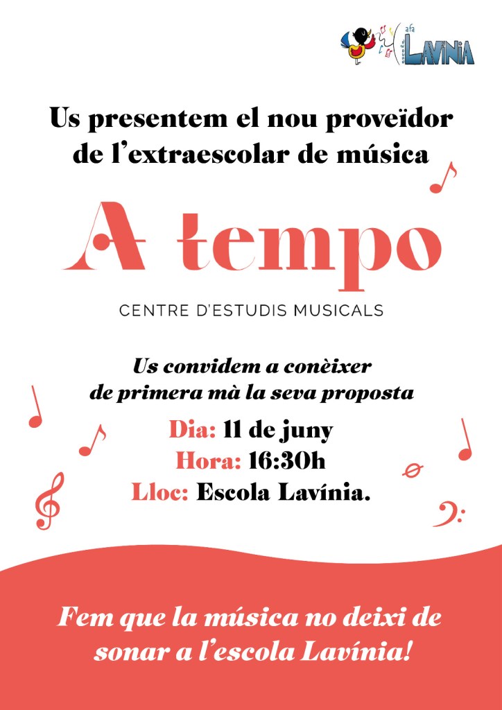A partir del curs vinent comencem una nova etapa a l’extraescolar de música i A tempo serà el l’encarregat de dur a terme aquesta activitat.