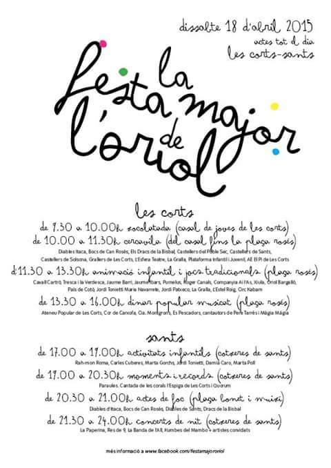 L’acte es farà durant tot el dia, el dissabte 18 d’abril de 2015. Hi haurà activitats de molts tipus diversos però en dos espais principals, el barri de Les Corts – plaça Rosés i a les Cotxeres de Sants.