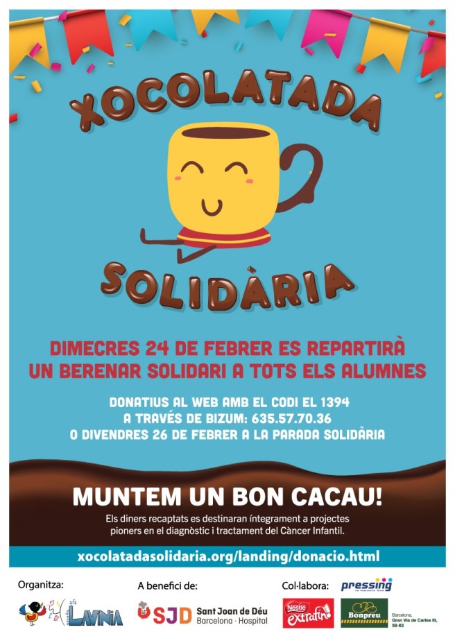 Un any més l’AFA Escola Lavínia ens hem inscrit a participar a la Xocolatada Solidària en motiu del Dia Internacional del càncer infantil (15 de febrer) i amb la finalitat de recaptar fons per al laboratori d’investigació de càncer infantil de l’Hospital Sant Joan de Déu.