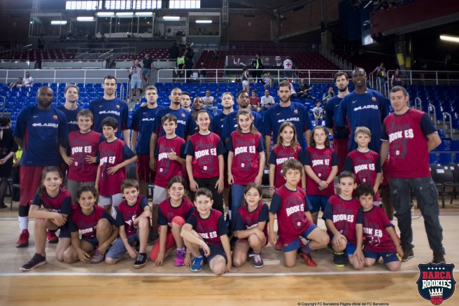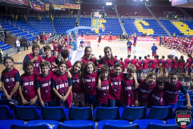 Aquí tenim dos moments dels equips de bàsquet de l’escola en la seva visita al Palau Blaugrana per presenciar el partit de lliga ACB Barça – València de Bàsquet. Els nens van gaudir de l’escalfament a peu de pista i amb els jugadors en la fotografia.