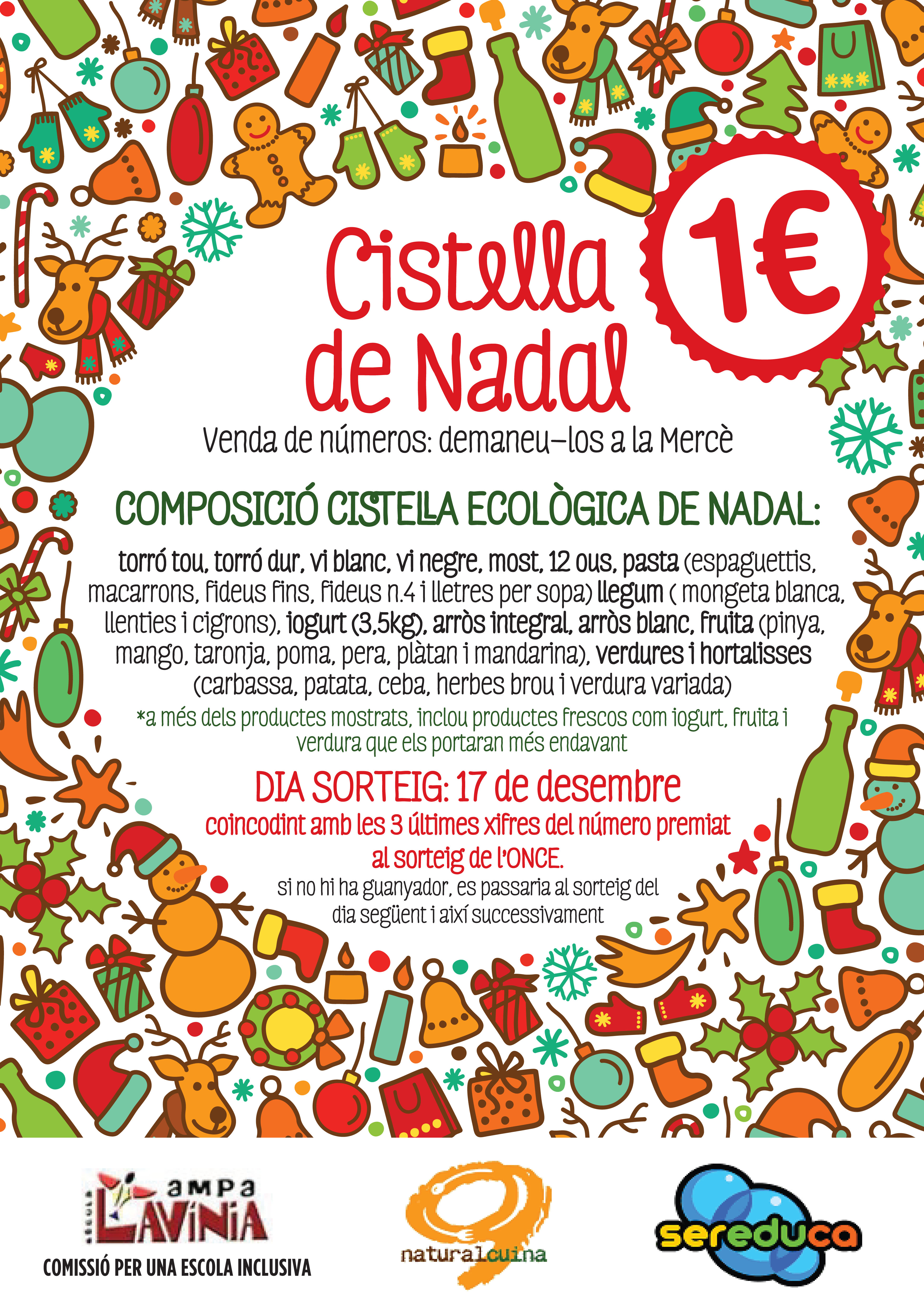 Aprofitem aquesta entrada al bloc per recordar-vos que, com d’altres anys, l’AMPA sorteja una Cistella de Nadal. Els productes que la componen provenen d’una aportació gratuïta de 9NATURAL CUINA, l’empresa que ens proporciona l’alimentació a l’Escola. Els beneficis que se n’obtinguin es destinaran a les activitats d’Educació Especial (suport als infants, monitors acompanyants) que gestiona la Comissió per una Escola Inclusiva de l’AMPA. El preu és d’1€ per número, i els podeu comprar a la Mercè. El sorteig serà el dia 17 de desembre i es farà coincidir amb les 3 últimes xifres del número premiat al sorteig de la ONCE. En cas que no s’hagi venut el número premiat, passarà al sorteig del dia següent, i així successivament fins que hi hagi un guanyador.