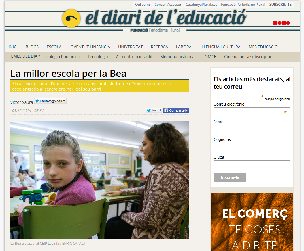 En ocasió d’aquest dia, “El diari de l’educació” (Fundació Periodisme Plural), ha dedicat un article a la nostra Bea, la Bea de tercer, i us convidem a llegir-lo perquè és molt interessant. “La millor escola per la Bea” parla del com s’integra a l’escola, de la relació amb els seus companys i companyes, així com de les dificultats que va trobar la seva família per aconseguir entrar a una centre ordinari. La Bea és segurament l’únic cas a Catalunya d’alumne amb síndrome d’Angelman que està escolaritzada a un centre ordinari.