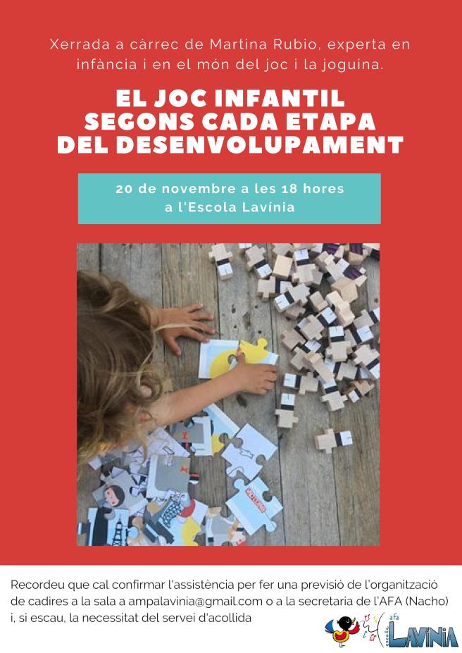 És per això que el proper dimecres 20 de novembre a les 18 hores, tindrà lloc a l’escola una xerrada per a les famílies sobre “El joc infantil segons cada etapa del desenvolupament” a càrrec de Martina Rubio Romero de Fustacadabra, mestra d’Educació Infantil i experta en infància i en el món del joc i la joguina, on ens donarà algunes orientacions perquè a l’hora d’escollir les joguines per als nostres fills o filles tinguem en compte quins són els més indicats.