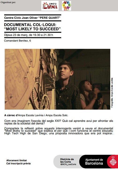 Des de la Comissió Escola Nova 21, juntament amb l’AMPA de l’Escola SOLC i el Centre Cívic Pere Quart us convidem al visionat i a la reflexió del documental “MOST LIKELY TO SUCEED” sobre què cal aprendre avui per afrontar els reptes del demà.