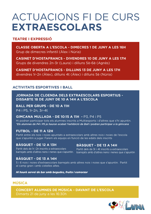 Aquestes darreres setmanes de curs seran intenses: els extraescolars de música, de teatre i expressió i les diverses activitats esportives i de ball han preparat actuacions finals de curs, obertes a totes les famílies.