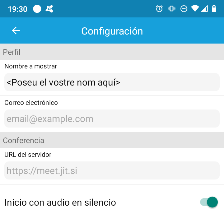Un cop tinguem instal·lada l’aplicació, procedim a obrir-la. Primer caldrà que anem a revisar les opcions de l’aplicació fent clic a la icona en forma de tres ratlles de la part superior esquerra de la finestra principal i anant a Settings (Ajustament / Ajustes). Aquí haureu d’escriure el nom i cognom per tal de identificar-vos i també marcar l’opció que permet iniciar amb el micro (audio) en silenci.